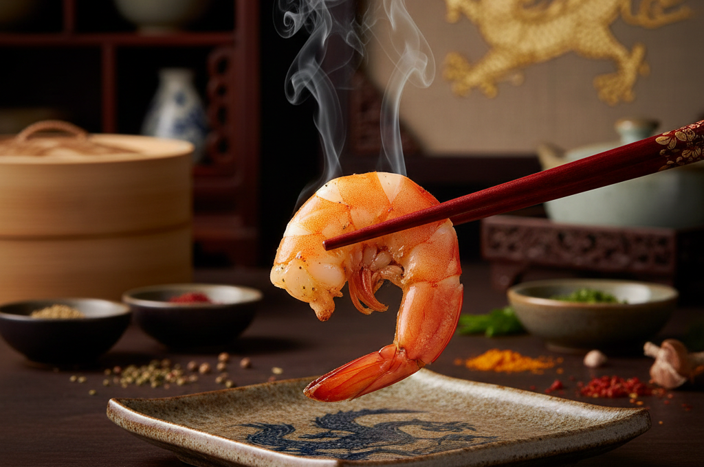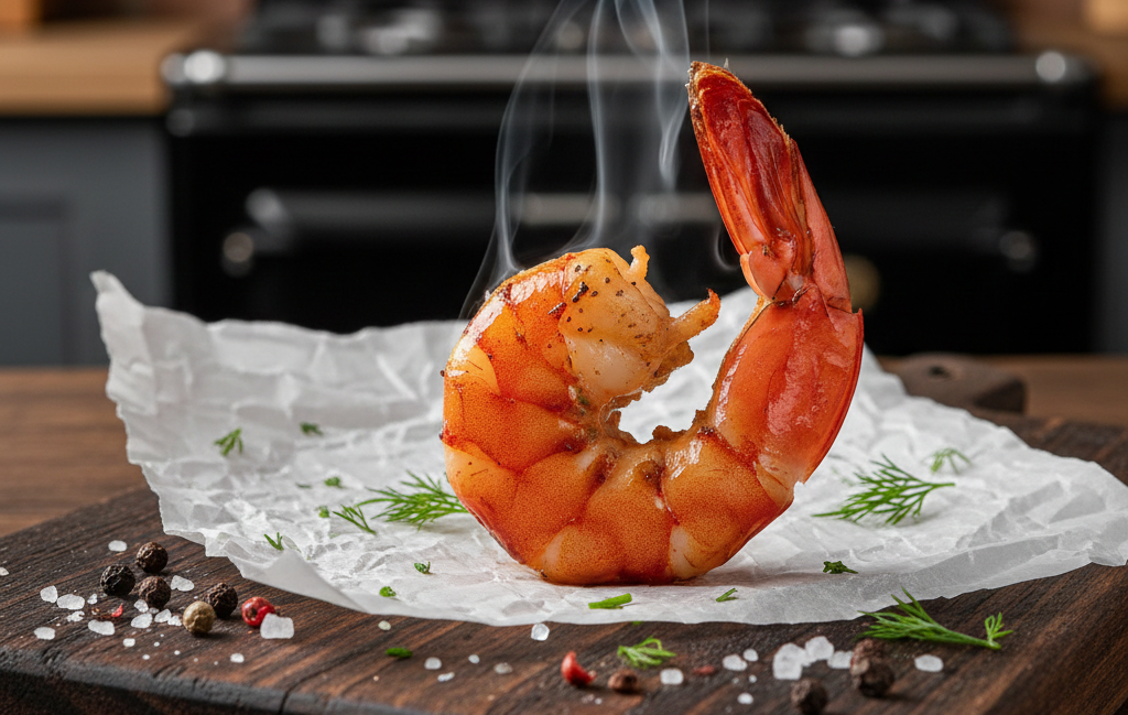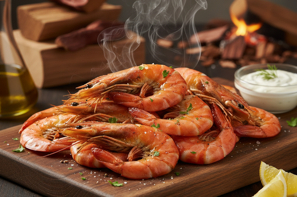 Tygří krevety (Tiger Prawns) naložené před vyuzením v marinádě z čínského koření, uzené teplým kouřem na třešni. cca 200 g. EASTFISH