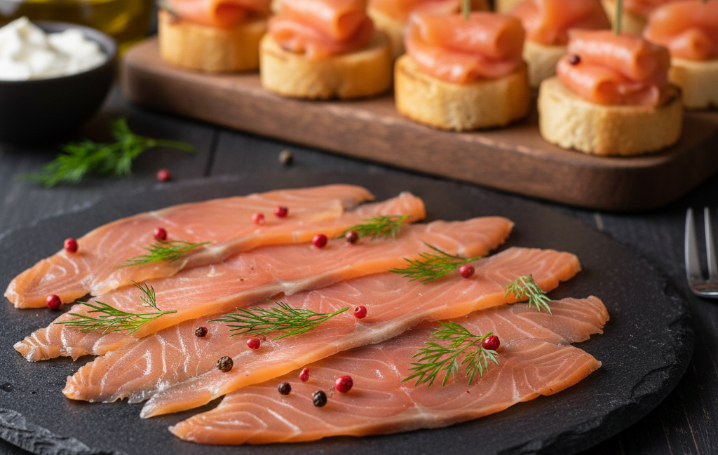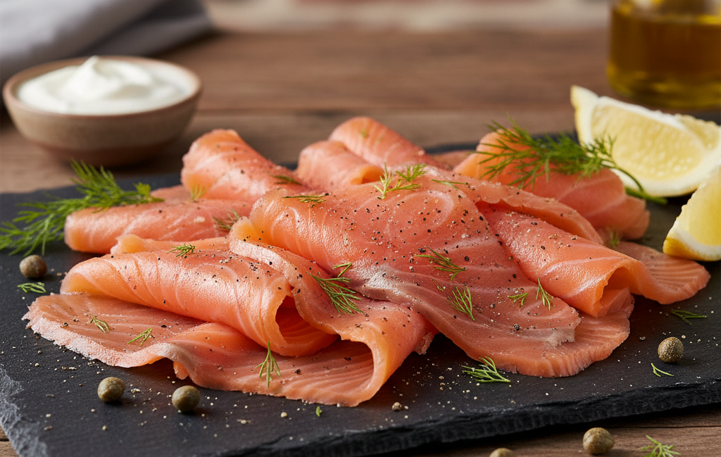 Plátkovaný losos uzený studeným kouřem.