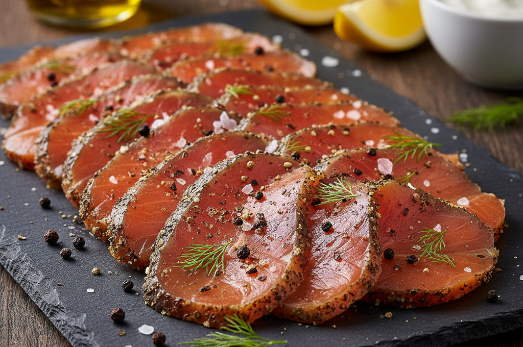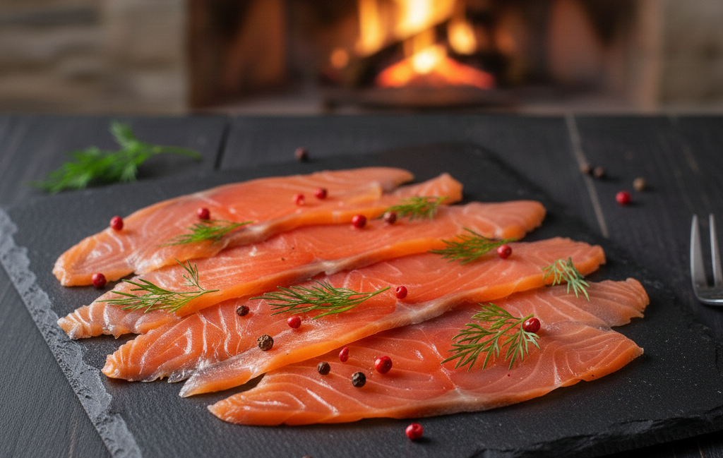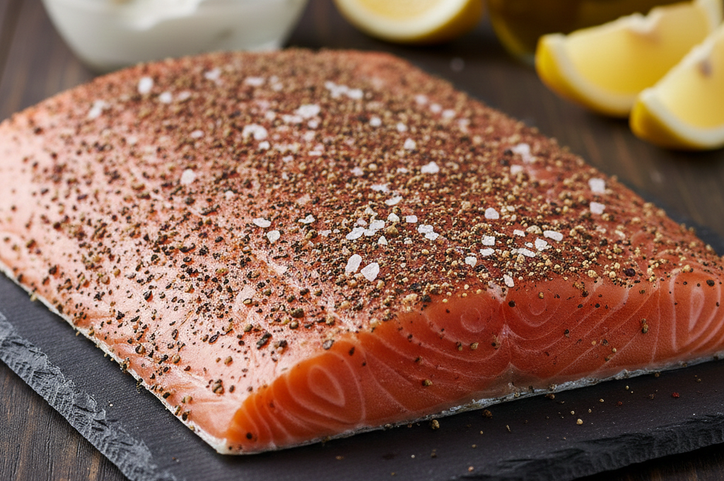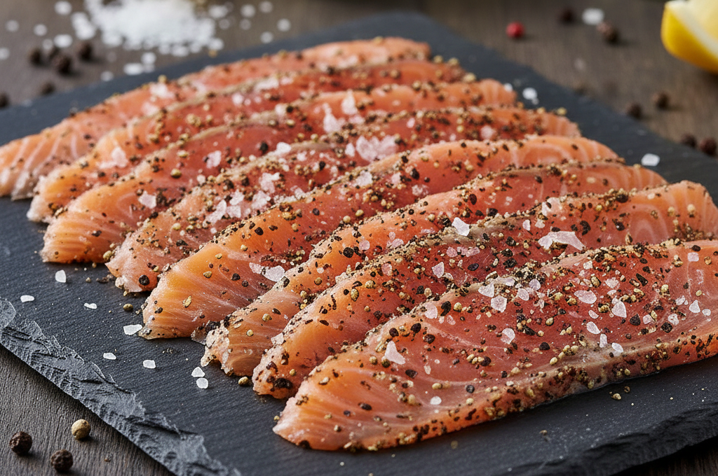 Teplým kouřem uzený plátkovaný pstruh s černým kampotským pepřem a himalájskou solí RYBÁŘSTVÍ MÍROV