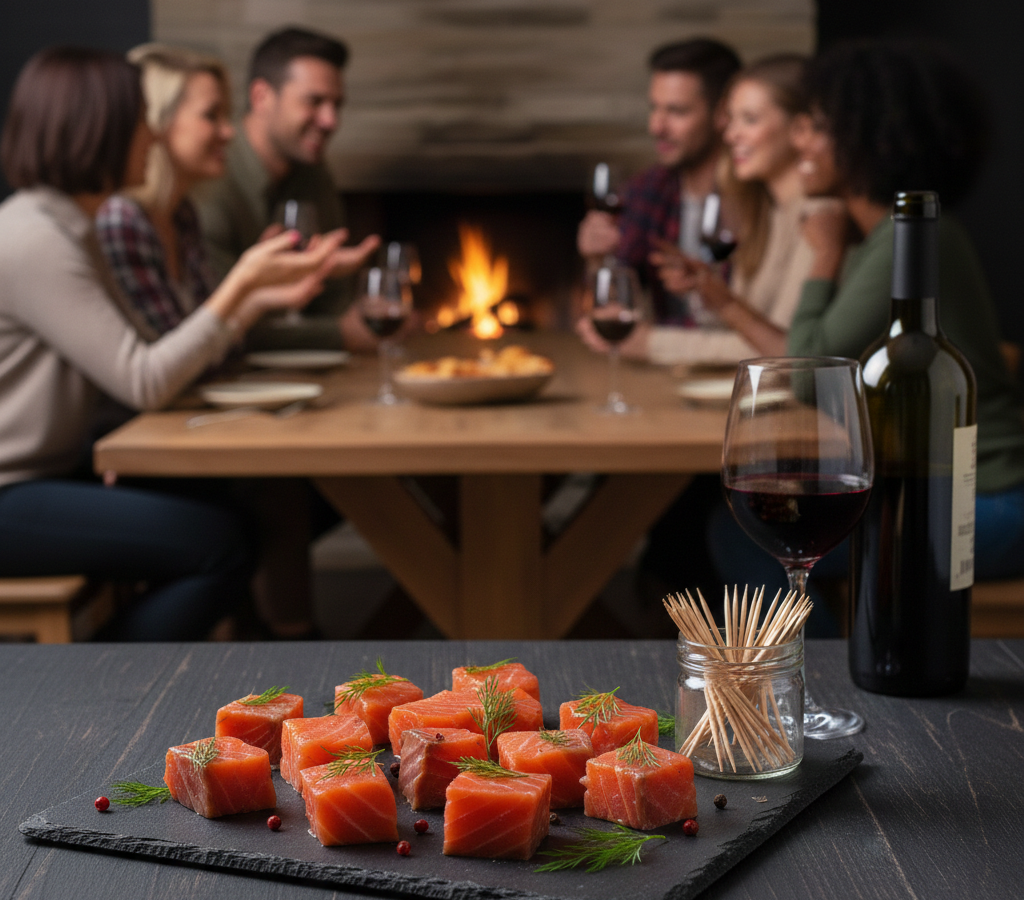 Lahodné uzené kousky lososa s jemnou chutí, ideální pro saláty, sendviče nebo studenou kuchyni.