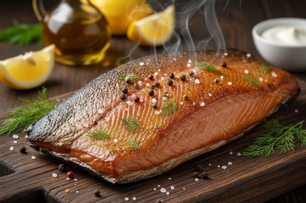 Lahodný uzený losos s jemnou chutí, ideální pro studenou kuchyni, saláty nebo sendviče.