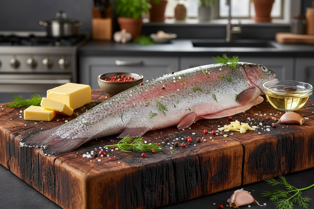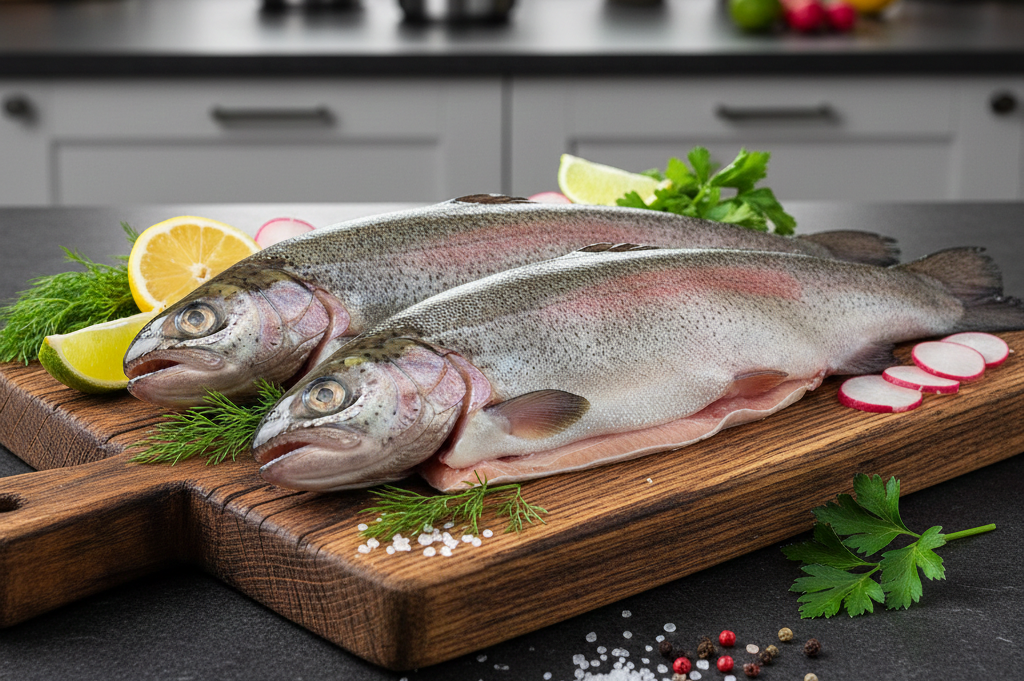 Celý, kuchaný pstruh lososovitý o hmotnosti 2–3 kg. Čerstvá ryba s jemným růžovým masem, ideální k pečení vcelku i pro profesionální gastronomii.