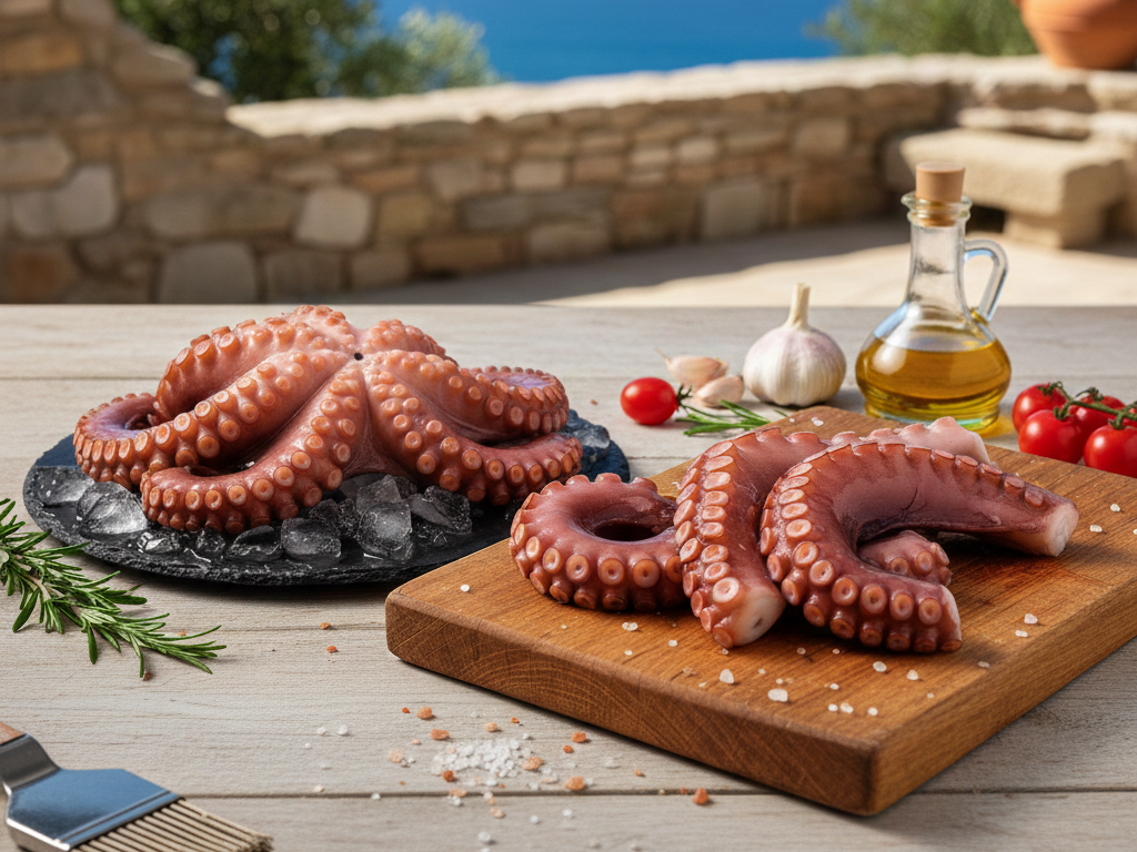 Prémiová mražená chobotnice typu Flower o velikosti 1000/2000 g. Jemné maso s mořskou chutí, ideální pro grilování, vaření i studené pokrmy.