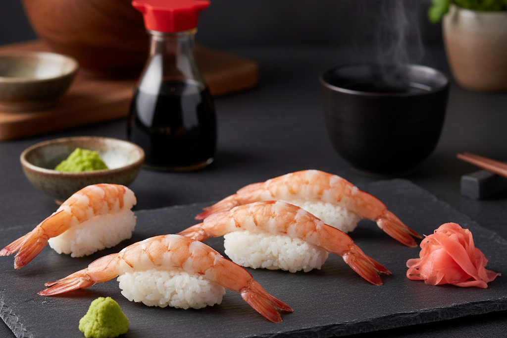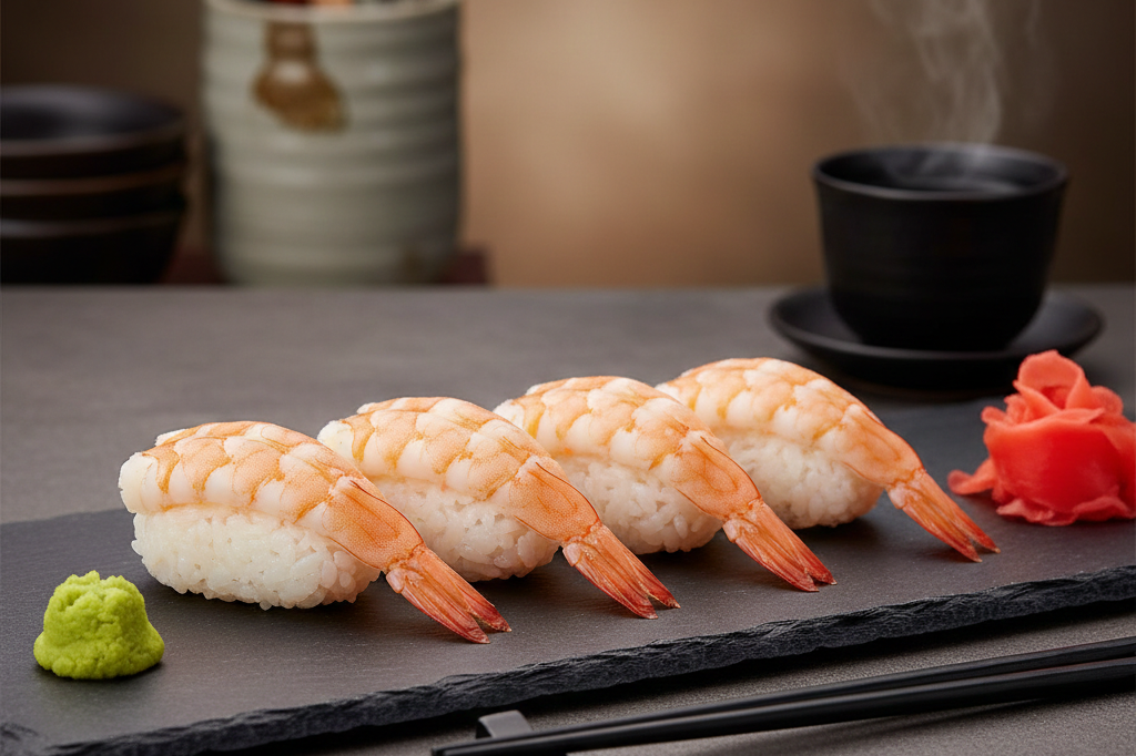 Krevetky na sushi Ama Ebi Topping 115 g, vakuum. Mražené, sladké krevety nejvyšší kvality. Loupané, připravené pro sushi a sashimi. Jemné chuti a šťavnaté struktury.