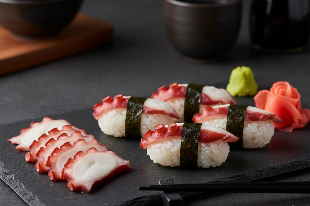 Mražené plátky chobotnice (Tako), 180g, vakuově balené pro zachování čerstvosti a chuti. Ideální pro sushi, sashimi, saláty i mořské speciality.