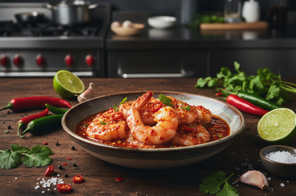 Syrové loupané krevety 16–20 ks v pikantní chilli marinádě, balení 250 g – ideální na rychlou přípravu pokrmů.
