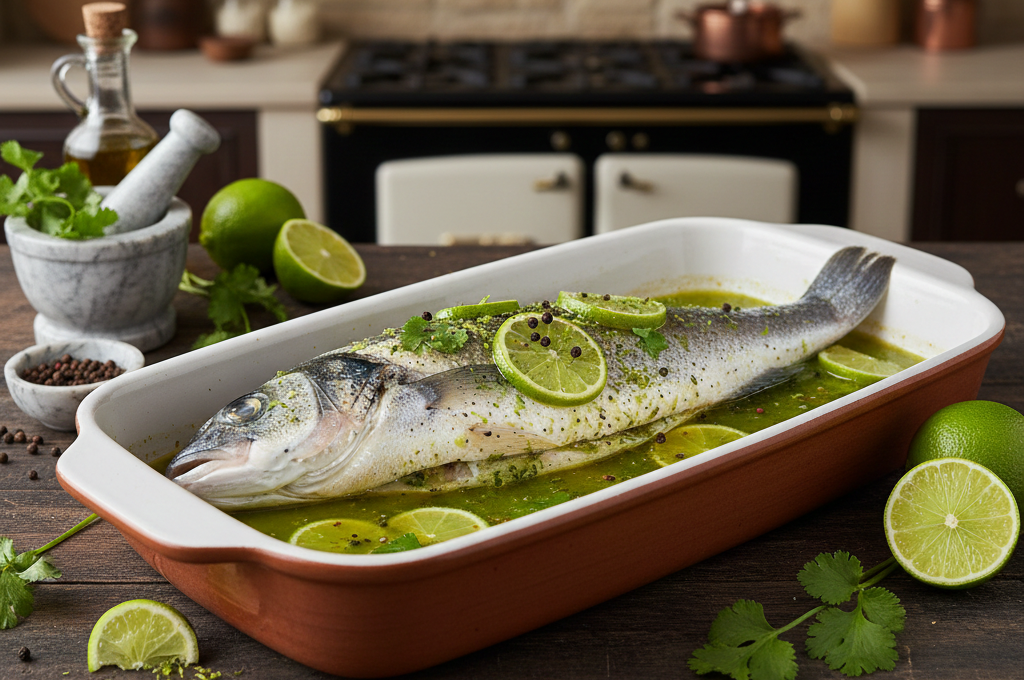Vlk mořský celý kuchaný v marinádě z limety a pepře, balení cca 330 g – ideální pro pečení nebo grilování.