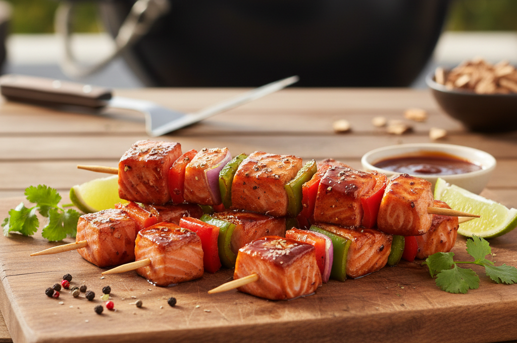 Kousky lososa bez kůže na špíz v BBQ marinádě, balení cca 360 g – ideální na grilování nebo rychlou přípravu pokrmů.