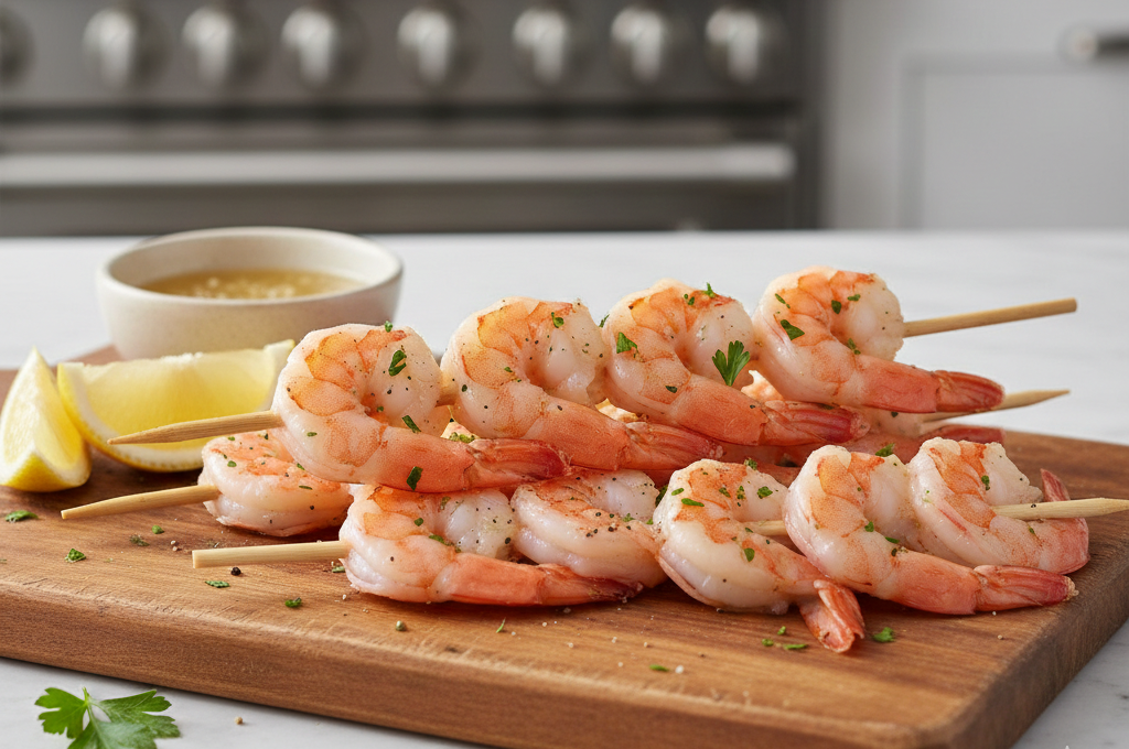 Loupané vařené krevety na špízu s cert. ASC. Prakticky naporcovaný produkt s jemnou chutí, ideální pro grilování i studenou kuchyni.