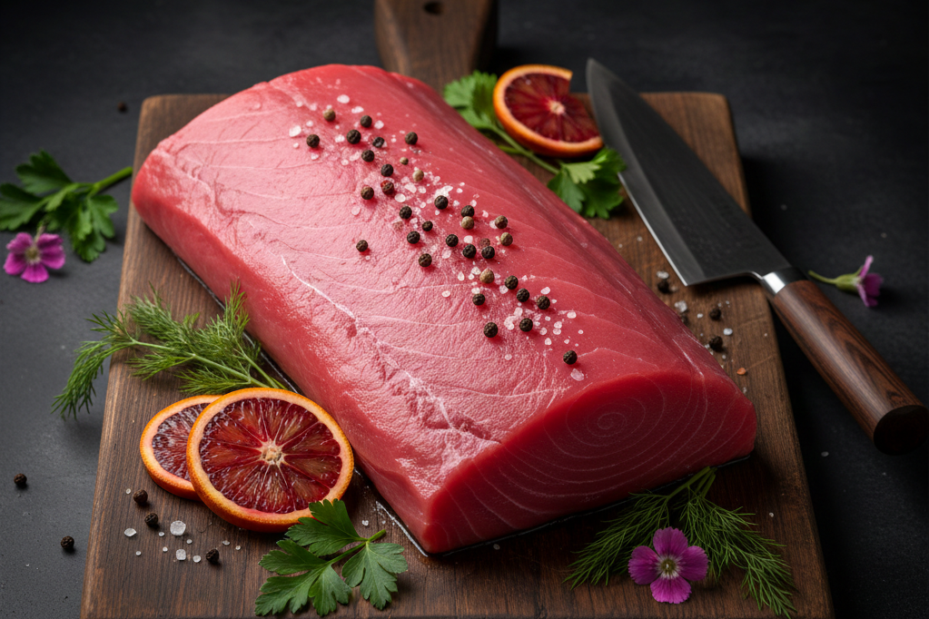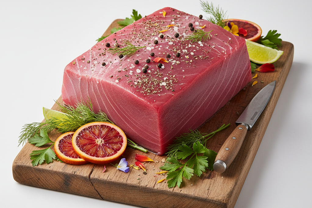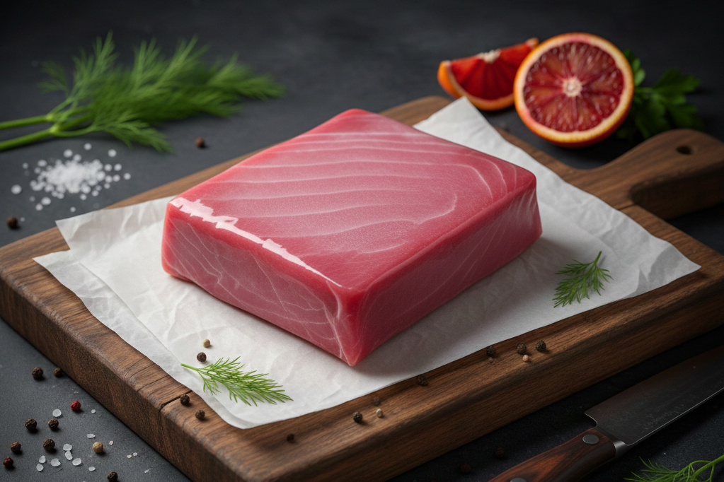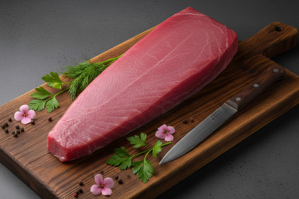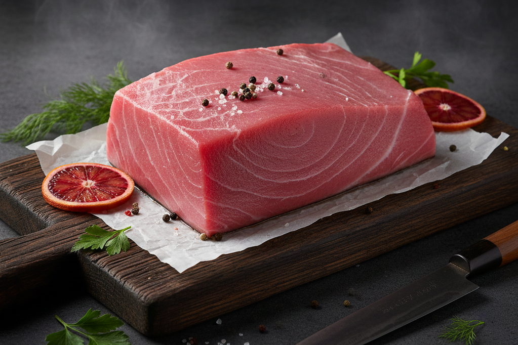 Prémiový tuňák Sashimi AAA, řez Center Cut, hmotnost 2–4 kg. Nejvyšší kvalita pro sushi a sashimi. Čerstvý, vhodný k syrové konzumaci.