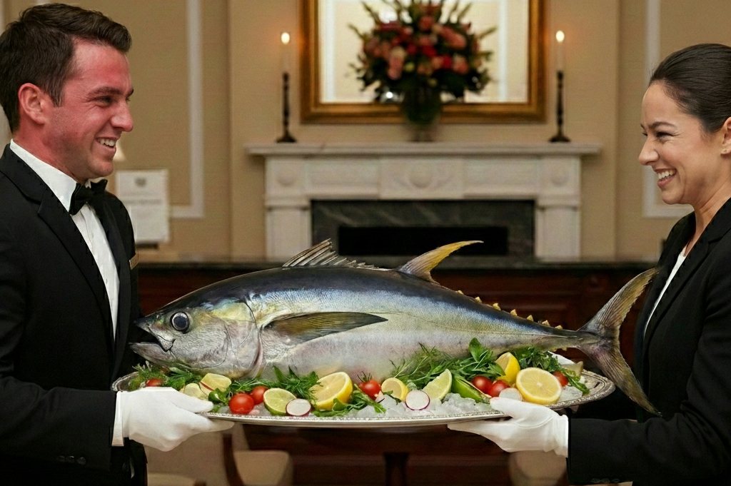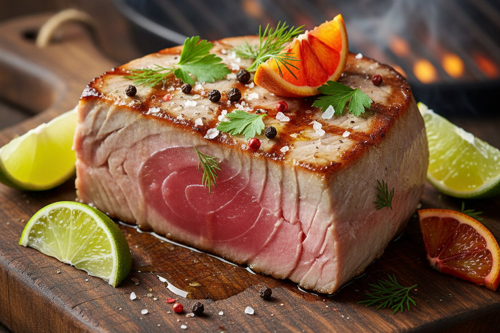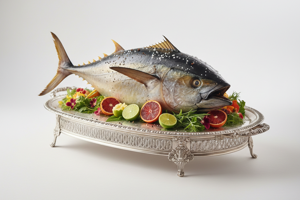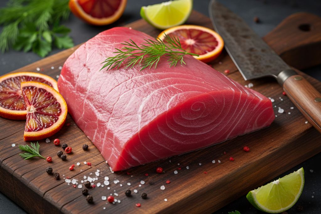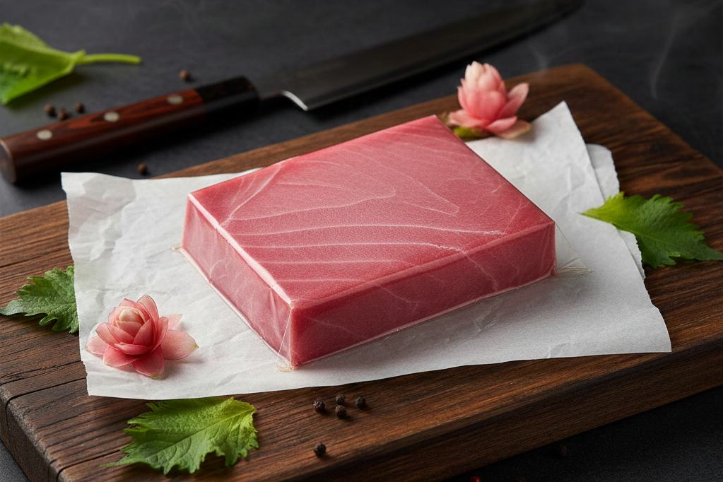Prémiový tuňák Sashimi AAA, řez Center Cut, hmotnost 2–4 kg. Nejvyšší kvalita pro sushi a sashimi. Čerstvý, vhodný k syrové konzumaci.