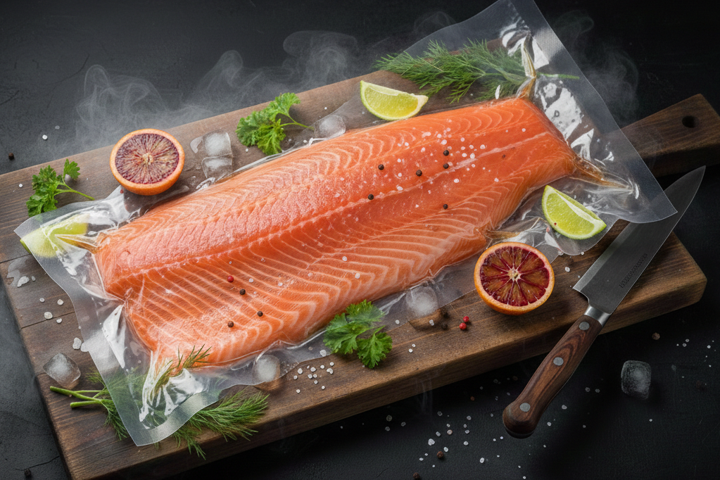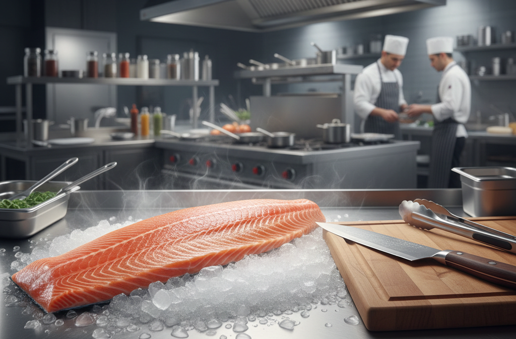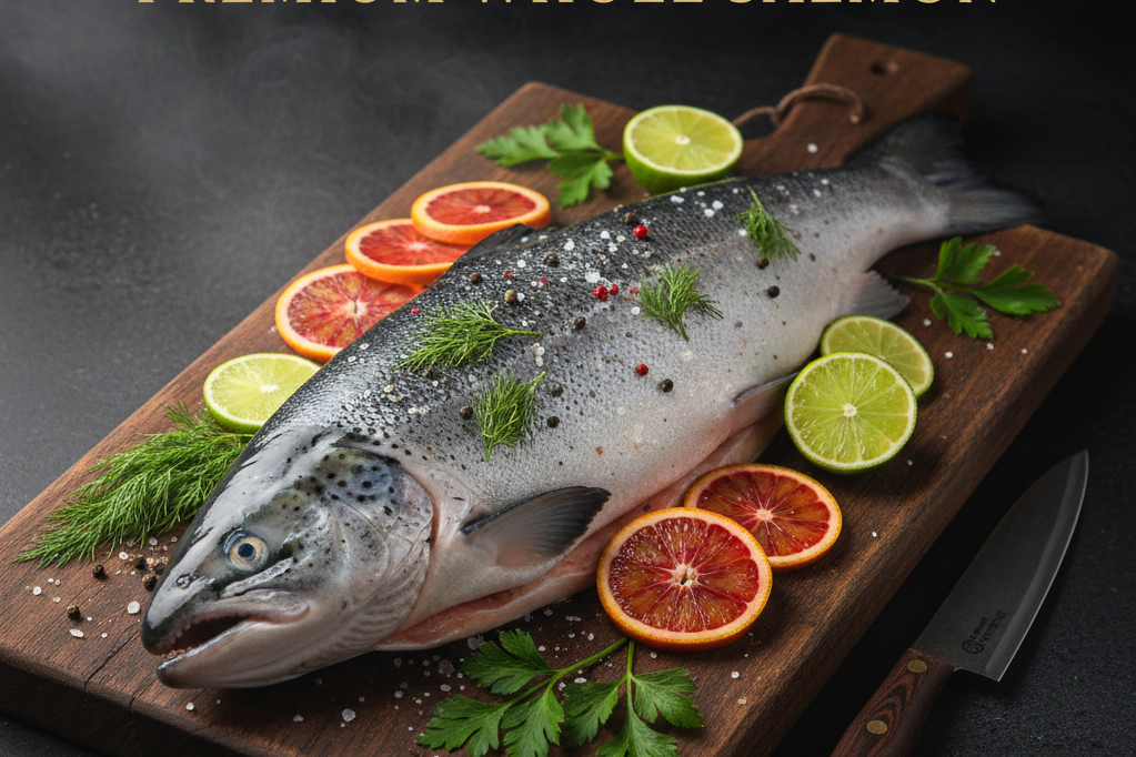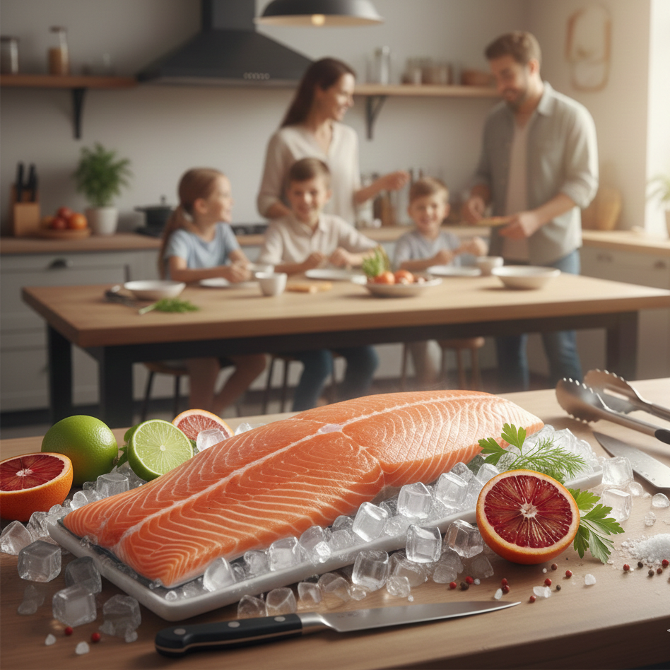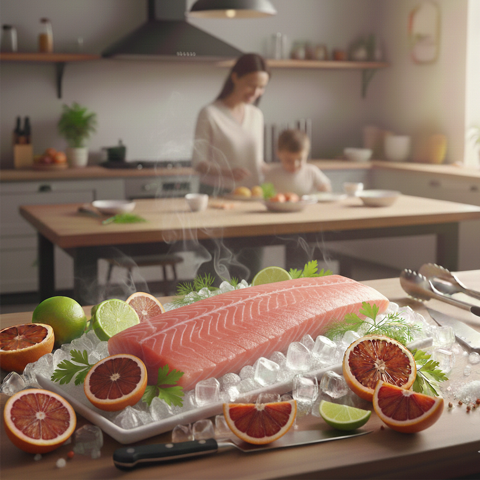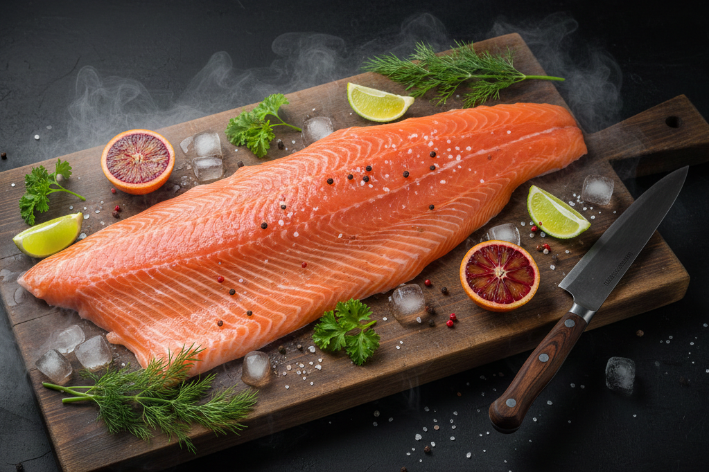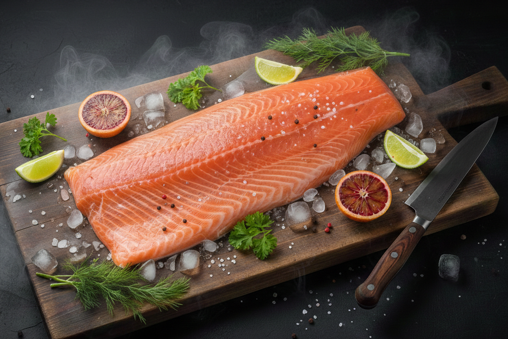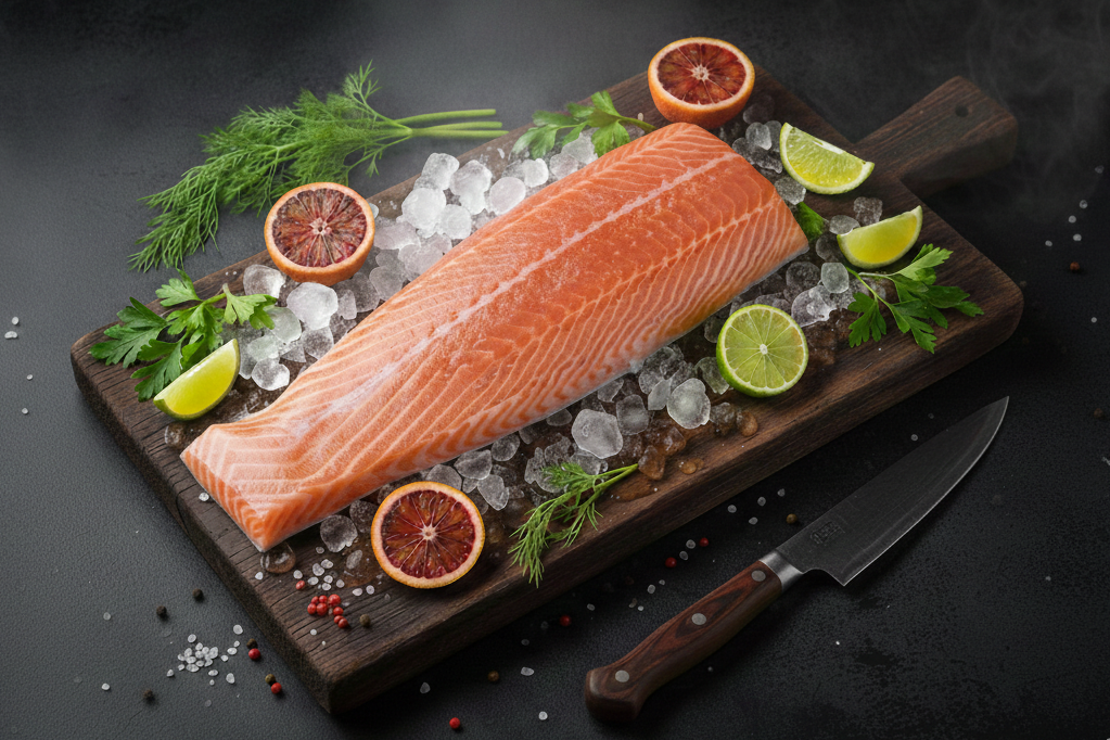 Prémiový sushi losos filet D-trim, s kůží a bez kostí, o hmotnosti 1,7–2,0 kg. Uchovávaný na ledu pro maximální čerstvost. Vhodný pro sushi, sashimi i tepelnou úpravu.