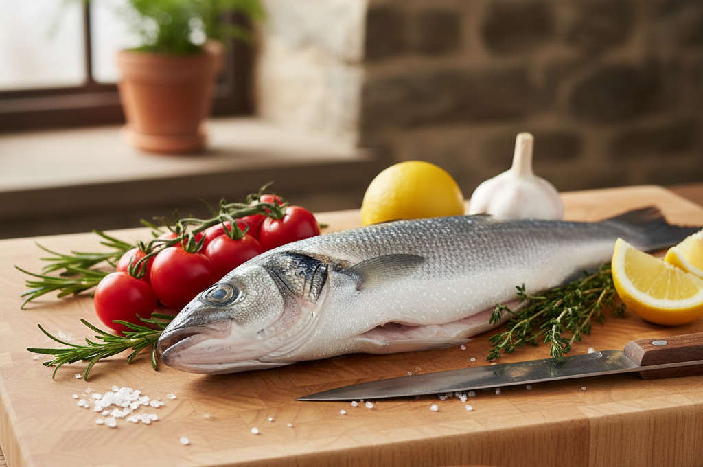 Celý kuchaný vlk mořský o hmotnosti 250–350 g, čerstvý a chlazený na ledu. Vlk mořský je prémiová ryba s jemným bílým masem, vhodná na pečení i grilování.